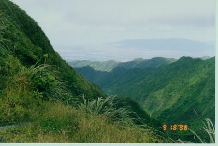 On Jan 1 2001 a friend and myself hiked the stairs. we ascended at about 1000 am. When we reached the first platform I started looking through the logbook. The first time I hiked the stairs I didn't look at the logbook. There was an entry for 630 in the morning proclaiming they were the first to climb the stairs and to see the first sunrise of the new millenium, (great idea.) when we reached the top we looked out towards the leeward side. We noticed that set of stairs going down the backside of the mountain. We decided to climb down and made a pact that if one or the other said it was to treacherous, we would go back up to the omega transmiter. the climb down was treacherous, but not impassable. the stairs actually do not start for about 500 to 750 feet down the backside. to compensate for this, there was a thick wire rope attached to stakes in the ground. The path was about 3 feet wide. The wire rope actually follows along a ridge. When we finally reached the stairs, we noticed that they only led down to three more platforms. I think these were the remaining transmitters. We then proceeded to climb back up to the omega transmitter. When we reached the top again, we decided to go offroad and climb to the next highest peak behind the transmitter level. We figured that it would take about ten minutes because the vegetation appeared to be just like grass. Boy were we mistaken the dense undergrowth was almost impassible, and at a few points I fell down a ridge. The only thing that saved me from realy dropping was the really strong groung palms that grow all over the ridge. After about 2.5 hours we finally made it to the peak, and the view of aiea and the Halawa valley was fantastic. Next time i will bring a machete. If this is something you want to pursue like us, bring a couple of items. machetes, gloves, nature bars, and plenty of water. The trip took an all told time of 5.5 hours.
